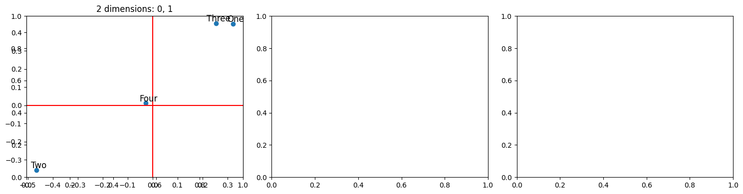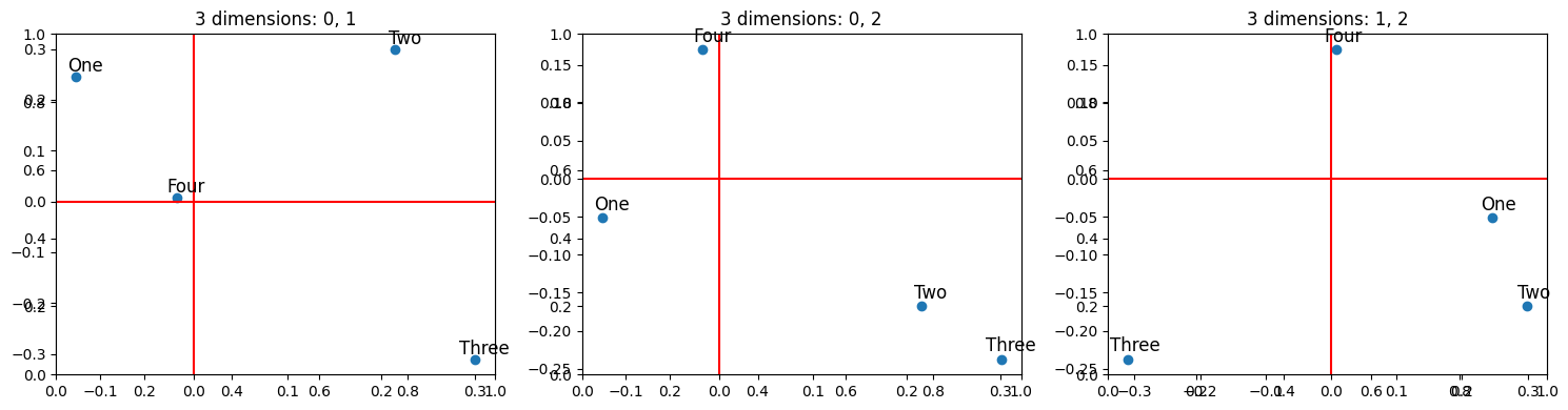 The similarity of the word vectors is determined by the angle between them. This can be observed visually, by imagining a line from the origin to one of the word vectors - any other points close to this line are similar. When looking at these graphs, it can be easy to think that vectors that appear far apart are dissimilar, but it is important to remember that it is the angle between them that matters. You can see, “Three” and “One” are similar and somewhat interfering compared to the other vectors. I consider this to be a polysemantic relationship.