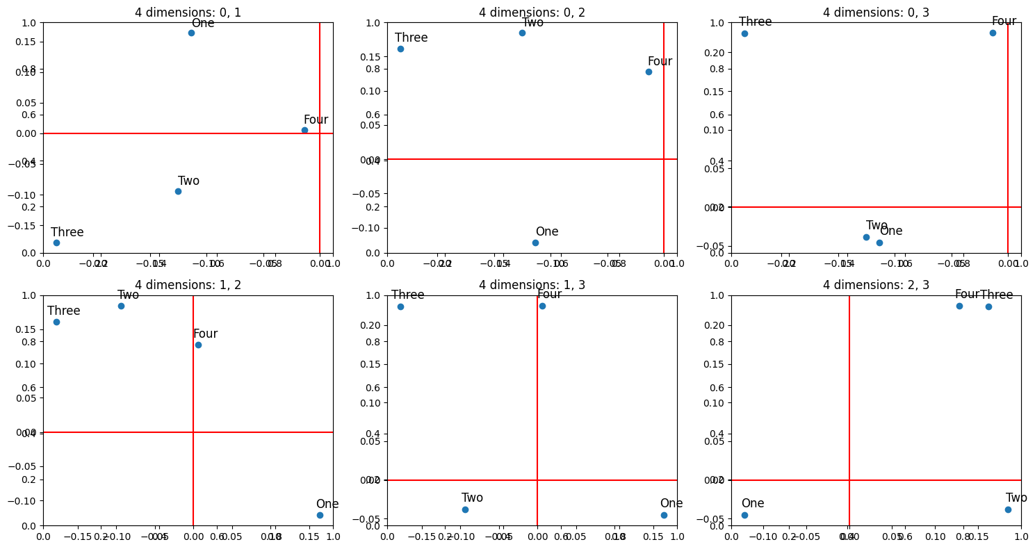 To begin with, I use “corpus_4”, which contains the sentences: “One”, “Two”, “Three”, and “Four”. Each word in the corpus is distinct and they occur independently of each other such that they represent four distinct features. This first graph plots all of the words in a 2-dimensional embedding model: