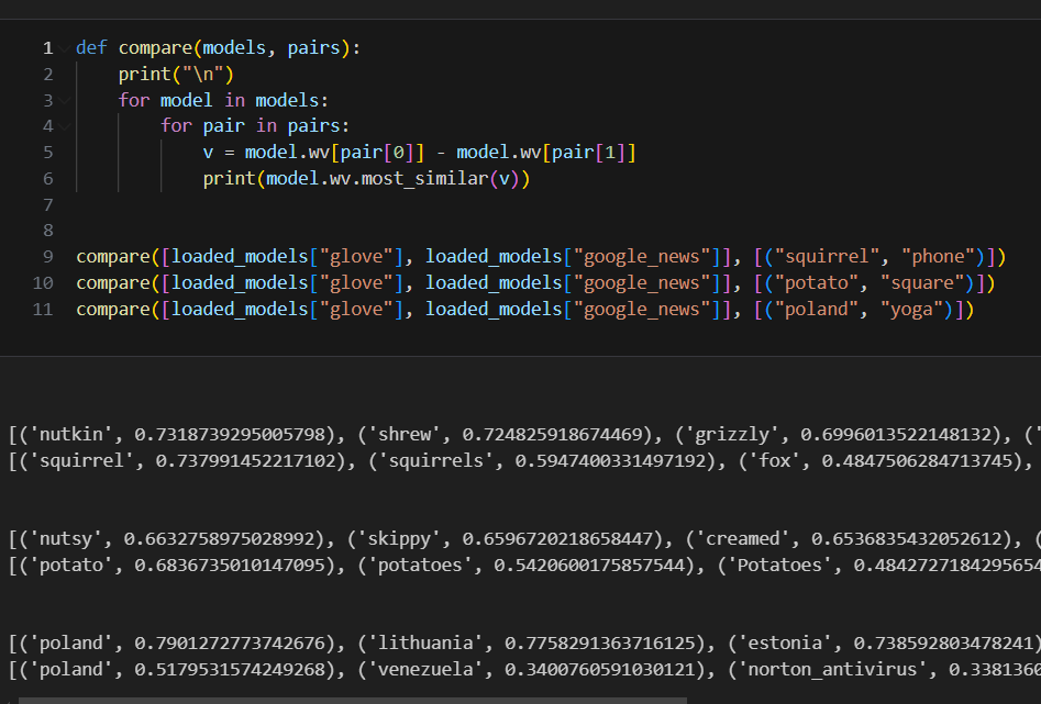 The output of the first compare , finding the most similar words between the word “squirrel” and “phone” produced different words in both the glove and google_news models. The glove model must have interference between the words “phone” and “squirrel” as it produces distinct words (e.g. “nutkin”, “shrew”). However these words seemed not to affect each other much in the google_news model as the most similar word to “squirrel” - “phone” is “squirrel”, with a lower similarity of 0.74. This could be because the “phone” vector has a low magnitude, or the two words do not interfere much. It also is likely to do with the sparsity of the embedding models. glove is only a 50 dimension model, while google_news has 300 dimensions.