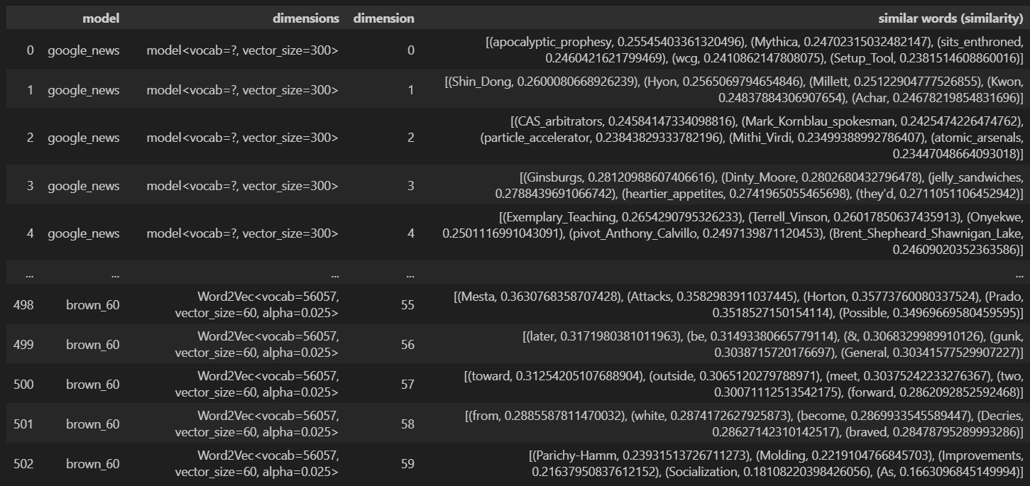 As you can see, there is little to no overlap with many of the models. The only models that have significant overlap are the Brown models of similar dimension size - this is not surprising as they are trained on exactly the same data and have similar dimensionality. I suspect that the cause of this is that a model’s dimension words tend to be quite obscure words from the training data. The most obscure words in the training data of a model likely do not appear in the training data of another. Looking at the top dimension words in output.xlsx, there are indeed many obscure words and phrases. Here are the top dimension words for the first 10 dimensions of the google_news model: